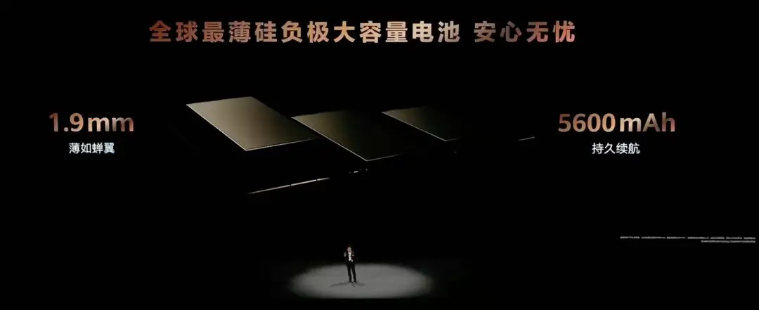为了做到这么轻薄薄的机身,华为给.Mate.XT.安排上了全球最薄的硅负极大容量电池,一折后面一块,加起来的总容量是.5600.mAh.,比二折的.Mate.X5.大了.500.多毫安时。