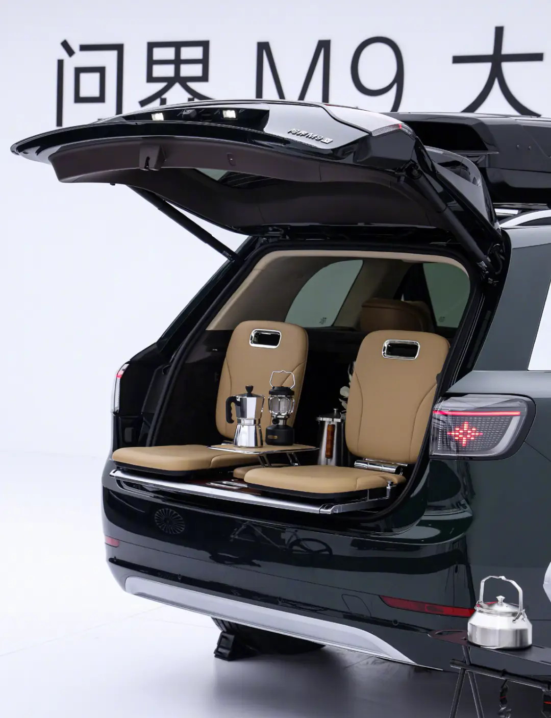 可能也是为了匹配这个使用场景,这次后备厢里多了车身高度调节按钮,车身最多可以降低.90mm.,降下来人就更容易坐上去了。