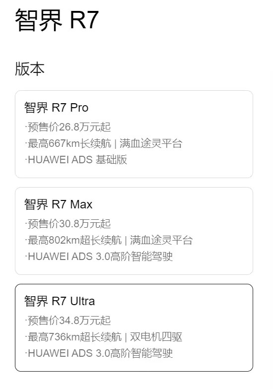作为市场上又一款.“Model.Y.杀手”,这次.R7.不光公布了内饰,还公布了预售价,有三个配置,26.8-34.8.万。低配不带激光雷达,中、高配是.ADS.3.0,其中高配是双电机四驱。