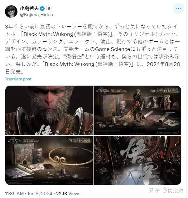 话说回来,知名游戏制作人小岛秀夫也在第一时间出来称赞黑神话,能让岛哥哥用“抜群のセンス(品味拔群)”的游戏可是不多见。