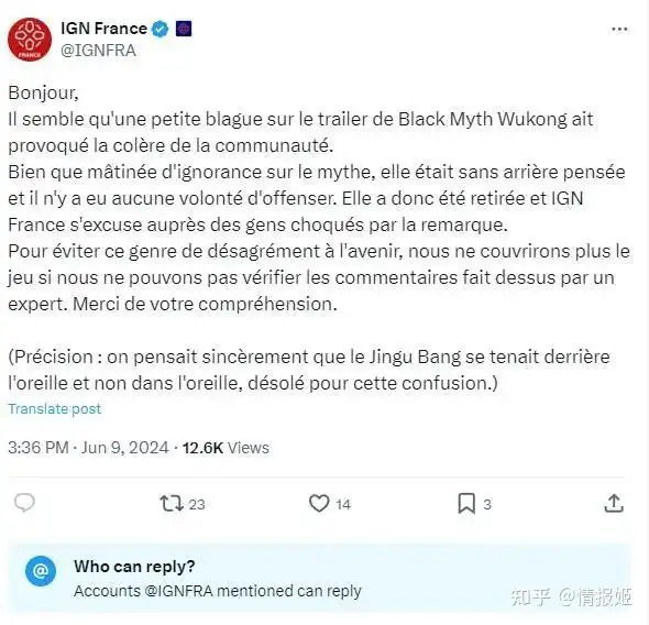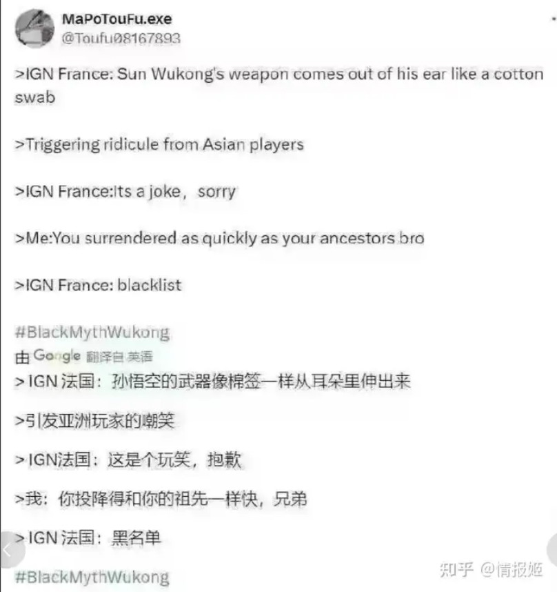 不知道IGN法国光辉战绩的可以搜索情报姬文章——“给世界带来更多的美好屁股的韩游《剑星》,让法国人破防了”。IGN法国在发布《黑神话.悟空》发售新闻时提到“把你的可以伸缩的魔法棒放在耳朵里是不是有点危险?这不是棉签”并配以流汗黄豆的表情。