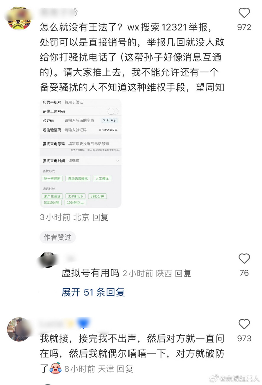 @京城红某人:感觉现在接的一多半电话都是骚扰电话,原来只会拉黑,今天学到了原来还可以举报 ​​​