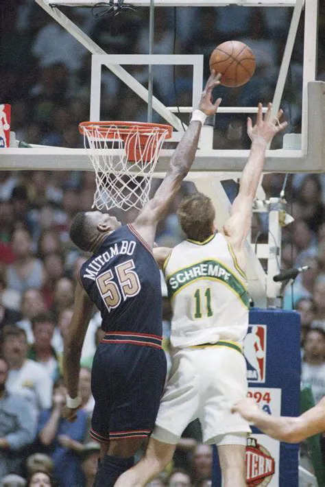 1994 年,掘金西部第八去战超音速。超音速先拿两阵 2 比 0。雨人在篮筐以上作威作福。当时掘金老爷子丹?伊塞尔都对队员们说这话了:“我们今年参加季后赛就是来积累经验的。” 掘金第三场狂胜扳回,第四场加时险胜。穆托姆博第三场 13 板 6 帽,第四场 16 板 8 帽。