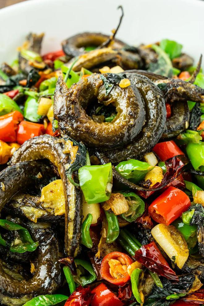 在重庆江湖菜中还有一道用鳝鱼炸制出来,风味不输辣子鸡的下酒名菜 ——?盘龙鳝。