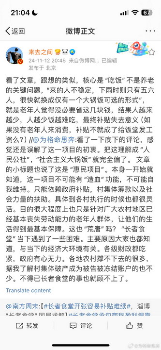 @为格命思奔:看来总 @来去之间 转了,这个再解释一下吧。农村是一个完全不同的社会生态,可能与大家想的完全不同。长者食堂的核心是 “吃饭”,但也不仅仅是吃饭。