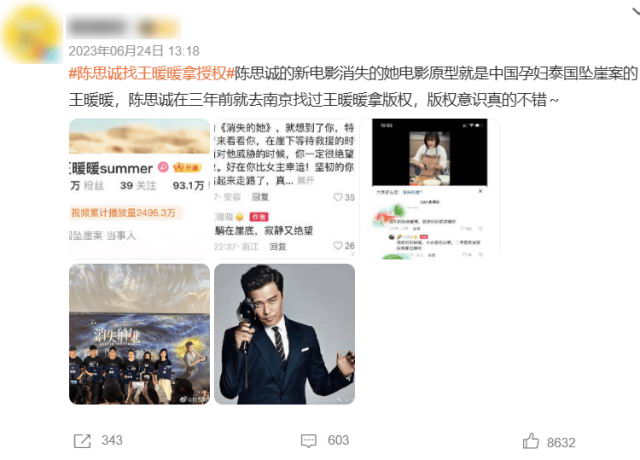 再比如 “陈思诚找王暖暖拿授权” ,这是《 消失的她 》上映前后出现的话题,在这个话题下,大家迅速把电影跟之前全网轰动的 “ 泰国孕妇坠崖案 ” 联系起来。