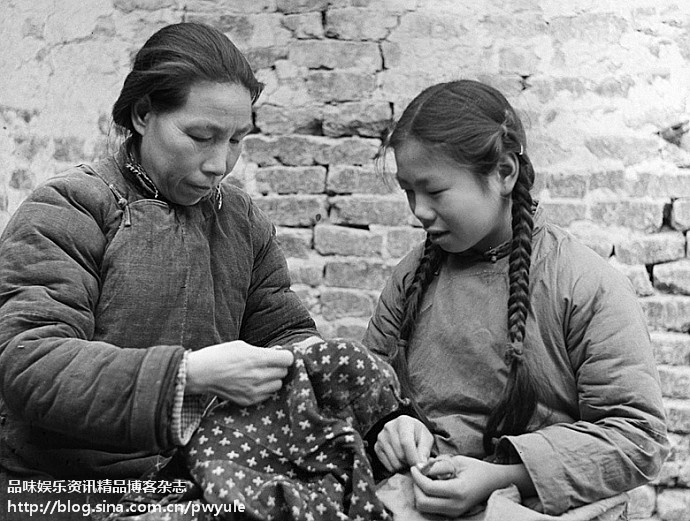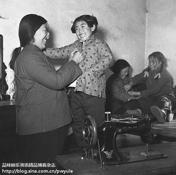 1958年2月,湖北孝感县朋兴乡的生产能手晏桃香一边缝衣服一边向女儿传授经验。那时的农村妇女几乎人人都是家庭成员的服装制作者。她们农闲时常常自己动手为家人剪裁缝制衣服。