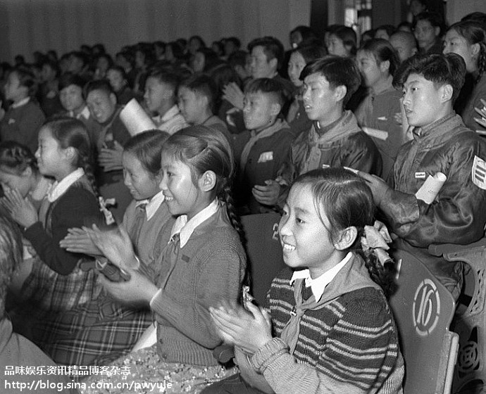 1954年11月,身着手工编织毛衣的北京小学生在观看演出。