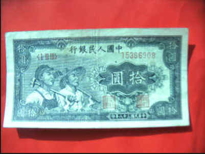 “这张人民币上面的工人就是我的画像。”指着一张绿色图案的第一套人民币拾圆人民币,86岁的杨琦老人笑着说。1948年12月1日,中国人民银行以华北银行为基础,合并北海银行、西北农民银行,在河北省石家庄市组建成立,并发行人民币。杨琦是第一套人民币的设计雕刻制版者和参与者,也是第一套人民币拾圆钞票图案上的工人原型。图为第一套人民币拾圆人民币。