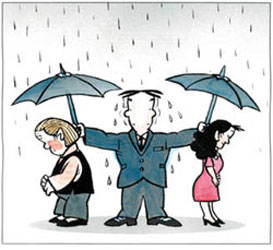 顺便说说我对圣经上所说的夫妻关系的感想:一开是我是很生气的,心想什么妻子要顺从丈夫,还三从四德呢。再看下去,就消气了,后面全都是讲要爱护妻子。我觉得这还算公平。男人本来就爱面子,希望被崇拜、尊重。如果女人对丈夫的尊重能够换来全心全意的爱护,我觉得是非常公平的。这一点可就比孔夫子强太多了。孔夫子只片面的强调女人的义务,而对女人的权利毫无保障。相反,儒教离充斥的是对女性的歧视。据我男朋友说,圣经里还说到了男人不应该离开自己的妻子,否则会有这样那样的后果。这对妻子的权益也是很大的保障。美国人大多数是信仰基督教的,不过有各种不同的派别。我认为美国人的宗教信仰在维持道德秩序方面还是作用不小的。美国人重视家庭的程度更甚于中国人。