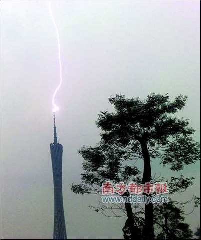 图为2011年4月17日,雷电“击中”广州塔。雷电灾害已成为影响珠三角地区的第四大灾害。