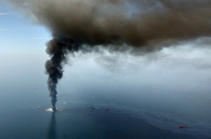 这张照片是2010年4月21日在墨西哥湾拍的空中照片,这里距意大利威尼斯东南的路易斯安那端点超过50英里(80.47公里),消防船正在努力扑灭发生火灾的深水地平线石油钻塔,从图上可以看到升入高空的滚滚浓烟和水面浮油。