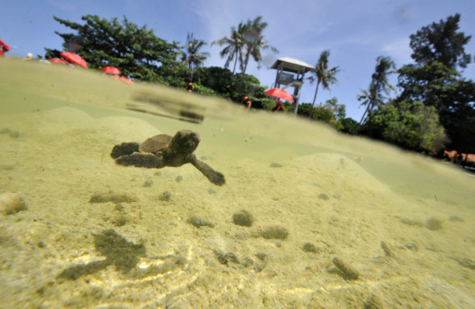 2010年4月20日,一群人在印尼雅加达北部北拉慕嘉岛举行放生仪式,把一只幼年玳瑁龟放入大海,并目送它潜入水下。他们把20只幼年玳瑁龟和4个月大的玳瑁龟放入海龟保护区。