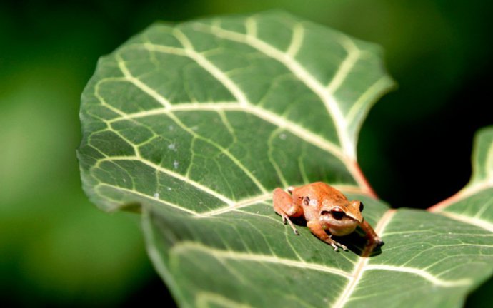 从2010年4月22日拍到的这张图片上可以看到,一只箭毒蛙属毒镖蛙静静地趴在麦德林植物园的树叶上。