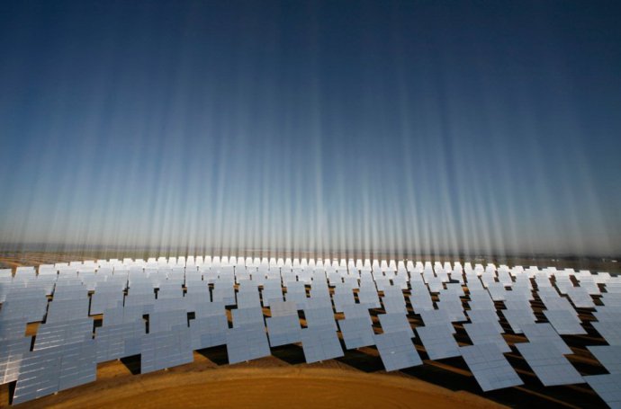 这张全景图展示的是西班牙塞维利亚附近的桑路卡拉马尤(Sanlucar la Mayor)Solucar电站光伏电池板。