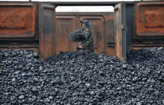 这张拍摄于2010年4月13日的照片,显示的是一名工人在中国辽宁省沈阳市火车站把煤炭从车上卸下来