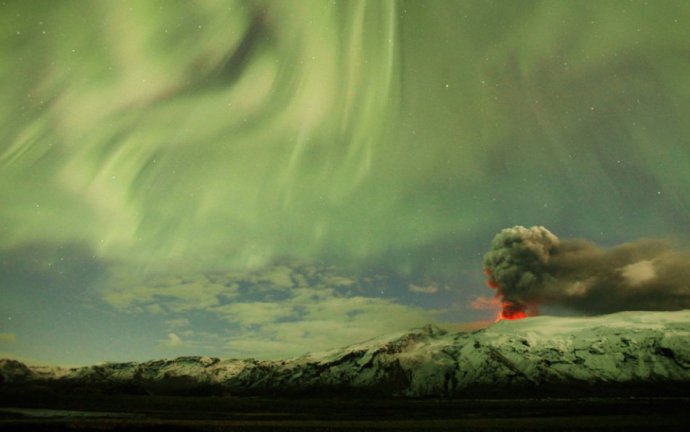 2010年4月22日黄昏,北极光出现在冰岛艾雅法拉火山喷出的烟柱上。