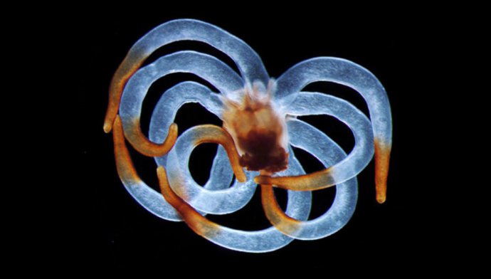 2010年4月18日刊出的这张照片,显示的是一只管海葵(tube-anemone)幼虫,成年后它将利用触须吸食血液。