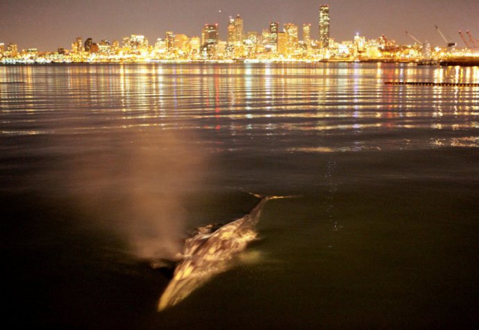 这张照片显示的是,2010年3月27日晚些时候,一只灰鲸在杜瓦米什河口游过。这只体长近40英尺(12.19米)的灰鲸从西西雅图半岛周围的海岸附近游过时,兴奋的人们看到了它。在美国皮尤吉特湾,这种灰鲸并没有虎鲸常见。在西雅图市区附近的艾略特湾,更难看到灰鲸。西雅图这个海港的海洋官员担心这只灰鲸会游到杜瓦米什河里,因为这里是主要工业区和环保组织“非常基金”所在地。
