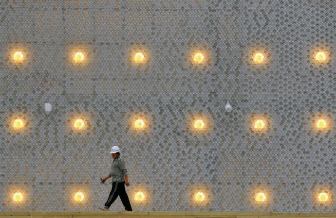 这张在2010年4月13日拍到的照片,显示的是一名工人从台湾台北国际花卉园艺博览会所在地,用回收的废旧塑料瓶建造的建筑物的一面墙前穿过。这个用塑料瓶制成的世界首个绿色建筑,将作为2010年台北国际花卉园艺博览会14座展厅中的一座,这次展会在11月6日开展。