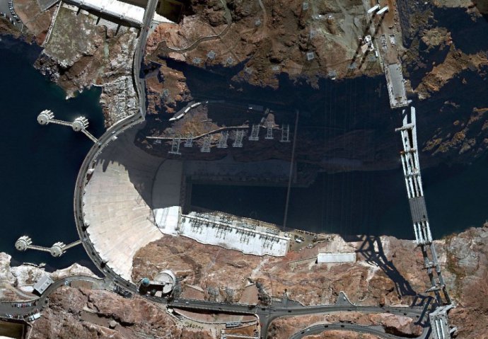 从2010年2月28日由一颗数字地球卫星拍到的这张图片上,可以看到位于美国亚利桑那州和内华达州交界处的科罗拉多河上的胡佛大坝。这座大坝一年产生的电能大约是42亿千万时。