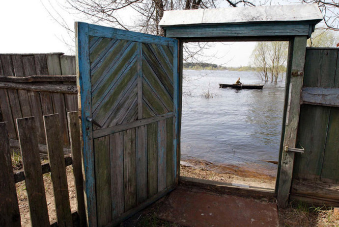 2010年4月19日,乌克兰基辅,一名男子在被洪水淹没的街道上划船。