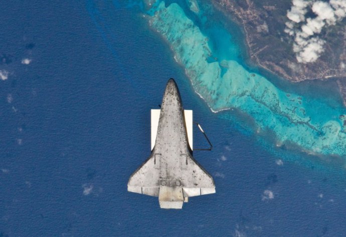 2010年4月17日“发现”号航天飞机与国际空间站分开后,远征23的机组成员在空间站上拍到这张图片,从它上面可以看到这架航天飞机的底部。背景处是距尼加拉瓜海岸约150英里(241.40公里)的普罗维顿西亚岛(Isla de Providencia)南端。