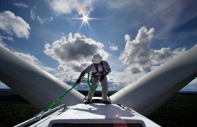 2009年7月14日,缅因州斯特森山风力发电站的运营经理迈克·科恩彻特即将检查一个300英尺(91.44米)高的风车,他正在检查安全绳是否已经系好。
