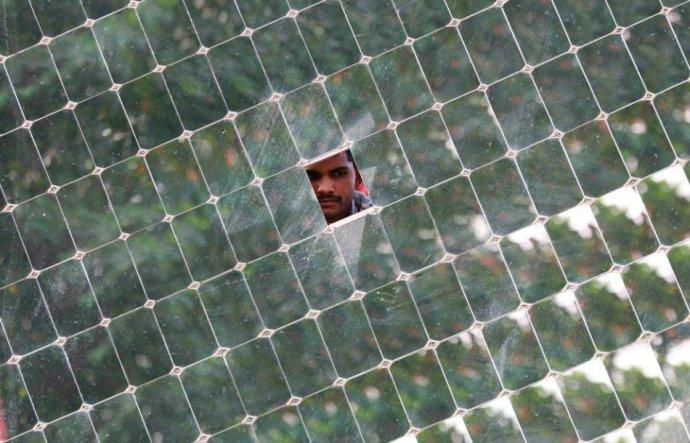 2009年12月16日,一名工人透过佳迪亚太阳能系统制造厂里的一个太阳聚光器往外看,这个工厂位于印度艾哈迈达巴德南部大约400公里的Gundlav村。