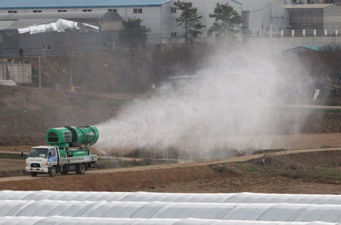 2010年4月20日,一名卫生官员开着喷洒化学药品的卡车,正在给韩国首尔西北大约30公里的金浦村周围的动物养殖场消毒,据报道,这里爆发了口蹄疫病。