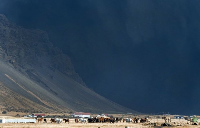 2010年4月22日,在冰岛艾雅法拉火山下面的一条被白雪覆盖的乡间小道上,一位骑在马背上的妇女赶着一群马前进。