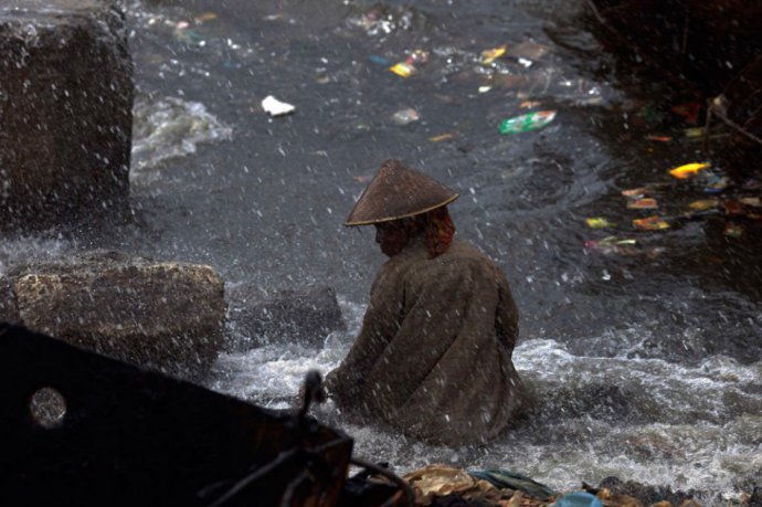 2010年4月16日,库尔尼亚(Kurniah)在印尼雅加达丹戎普瑞克港口附近的一个船只拆解地收集铁锈。库尔尼亚表示,她每天收集大约100公斤铁锈可挣到大约2美元。她把收集到的铁锈卖给中间商,中间商再把铁锈卖给加工厂。