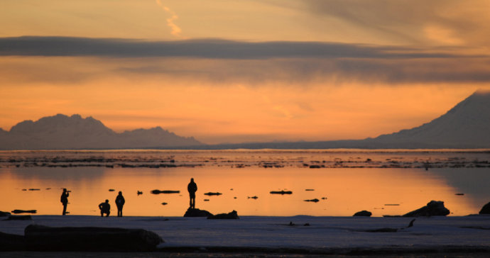 在2010年4月2日拍到的这张照片上可以看到,人们正站在阿拉斯加州安克雷奇艾尔德贝利公园附近冻结的泥滩上观看日落。斯普尔火山位于画面右侧。