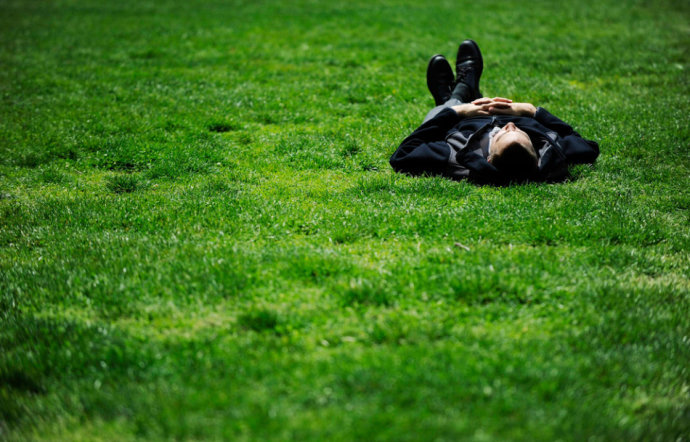 2010年4月22日,华盛顿阳光灿烂,一名男子躺在白宫附近的拉斐特公园的草地上休息。