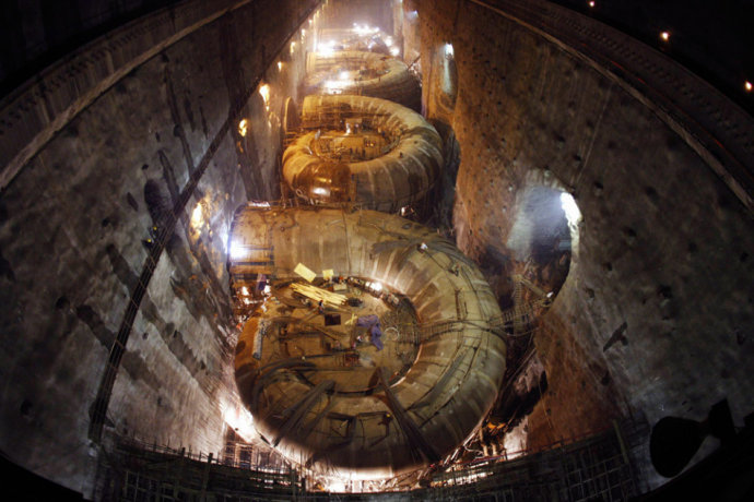 2009年9月10日拍到的这张照片,显示的是中国湖北省宜昌三峡大坝建造地几个大型涡轮机的内部景观。