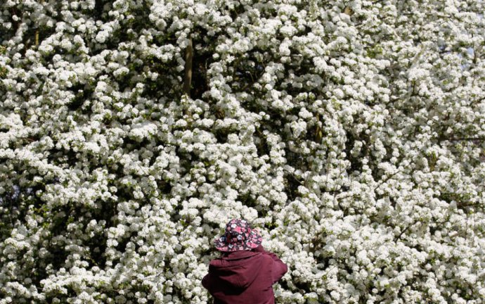 这张照片是在2009年4月15日拍到的,图中的那名游客正在伦敦西部的英国皇家植物园里给樱花拍照。