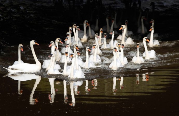 2010年4月12日,天鹅被从德国汉堡市阿尔斯特湖上的它们的冬季栖息地释放出来后,它们悠闲的在水面上伸展四肢,游泳嬉戏。每年工作人员会定期捕捉汉堡周围水面上的天鹅,并把它们带到冬季栖息地,在冬季给它们提供食物,并悉心照料它们,到来年春天再把它们放归自然。