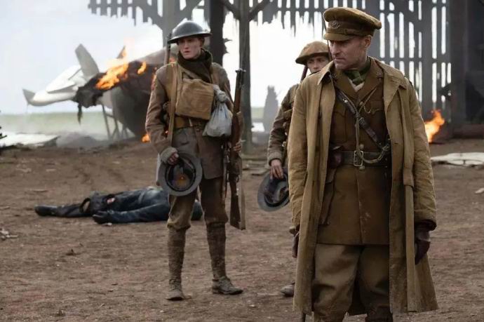 从上面的图也可以看出,步枪子弹不是走直线,而是抛物线砸到了对方身上,经常从肩膀射入,从后腰射出,这也是为啥英军头盔长得跟个草帽似的,就是为了防止子弹从天上掉下来。我放一个《1917》的剧照,大家可以看看: