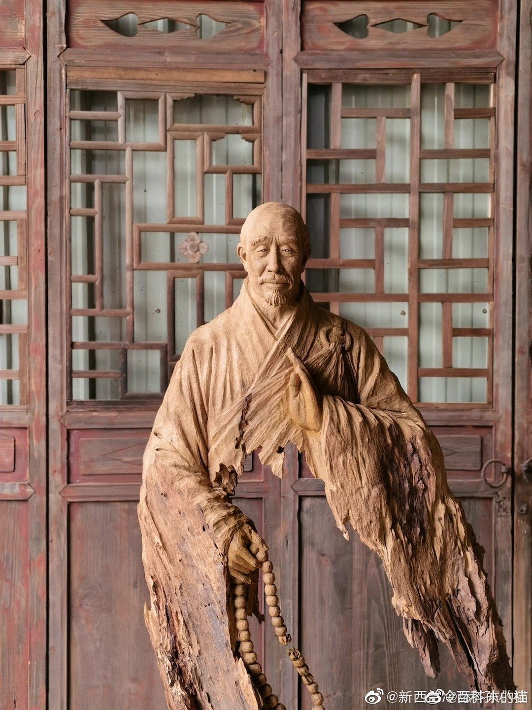 1,《弘一法师》,作者是 @舔芥末的猫 。是这组作品里唯一的木雕。