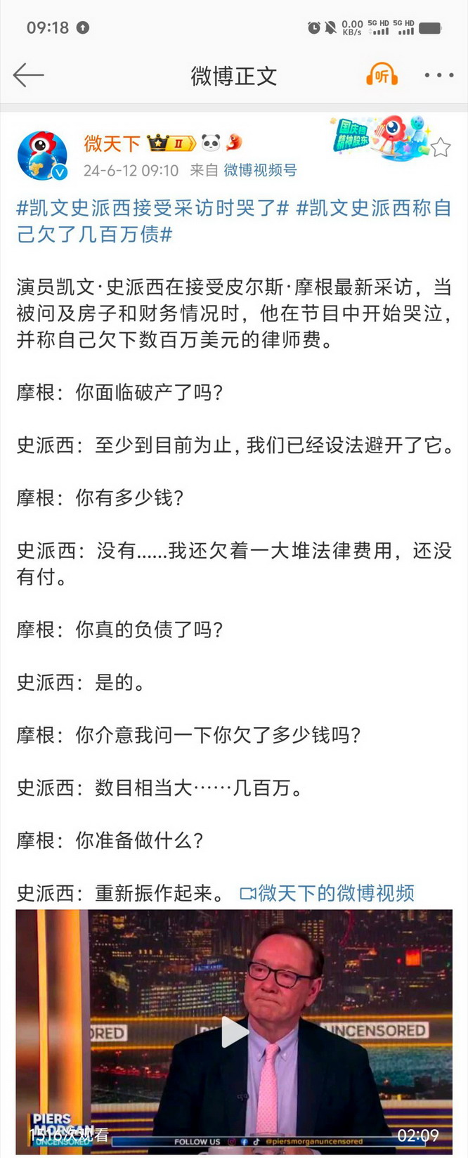 @一玶海岸:今天看到 #凯文史派西接受采访时哭了 ## 凯文史派西称自己欠了几百万债# 两个热搜,俺要为木下总统发一贴。