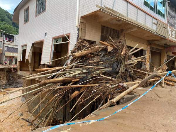 此时,杨德清的小舅谢力开的餐馆,已是一片狼藉。冰柜裹着泥浆横倒在门口,往上走,黄泥掺着碎屑、树叶一直染到了二楼楼梯转角处。“之前房子进水最多也就1米左右,这次大概有4米多吧,”杨德清说。