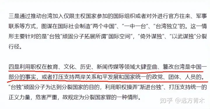 《意见》的第四条说的很清楚,利用职权在教育、文化、历史、新闻传媒等领域大肆歪曲事实,煽动台独的团体和人员,明确被定义为《分裂国家罪》的一种情形。
