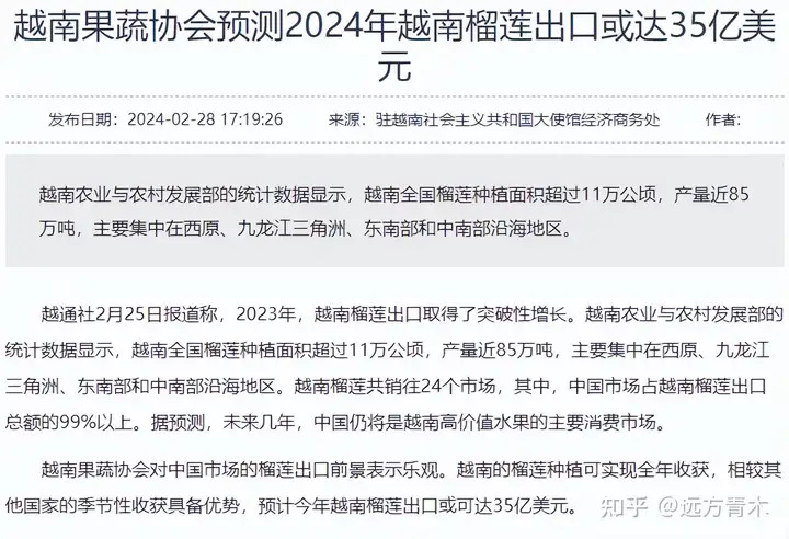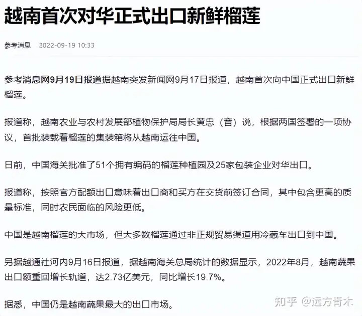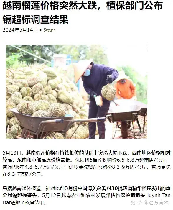 你想想,数年后越南新增的接近10万公顷的榴莲开花结果,一旦被中国发现检疫出现问题啊,这里有害虫那里重金属超标等等,被迫减少出口甚至中断出口,那损失将会多么的巨大。