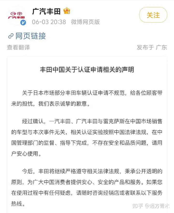 因为舍不得中国市场,为了保住中国市场的销量,广汽丰田以丰田中国的名义发了一封公开信,说一汽丰田、广汽丰田与雷克萨斯在中国市场销售的车型与本次丰田汽车数据造假事件无关,因为在中国销售的丰田车是在中国管理部门的监督和指导下进行质量认证的,符合中国的法律法规,不存在安全和品质问题。