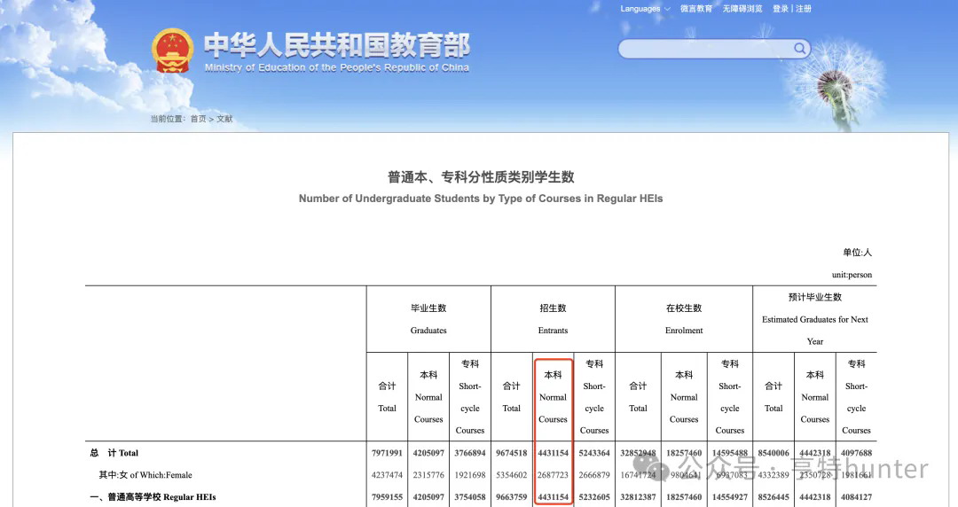 本着求真务实的态度,我去教育部官网看了下原始数据,我只找到了 2020 年的数据,2020 年本科招生女生是 269 万,总人数是 443 万,对应男生是 174 万,本科招生的男女比例是 1:1.55。