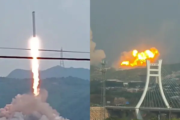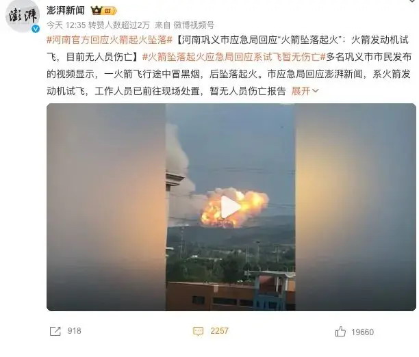 事情是这样的,昨天下午一个画质模糊的视频在各个群里和微博上传疯了,一只火箭刚起飞就掉下来炸了,位置在河南,当地人站楼上都能看见。