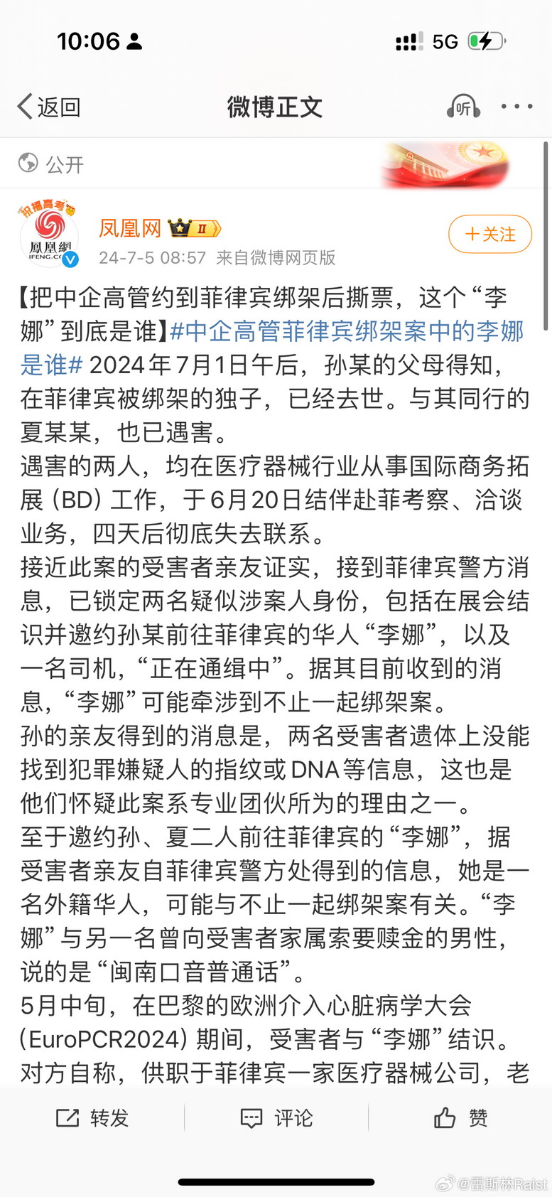 @雷斯林 Raist:说菲律宾绑架的事情,是由一个华人在巴黎把两个高管约到菲律宾谈生意,然后才把他们绑架撕票的。