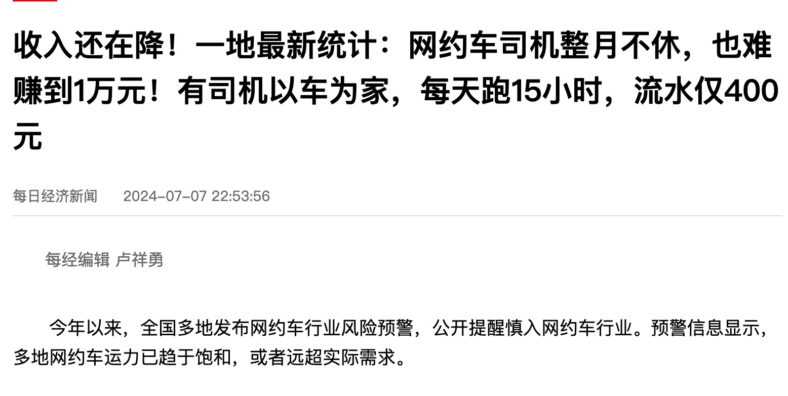 上面提到的是,广州当地网约车司机日均营收从 343.34 元降至 311.63 元。意味着一些网约车司机即便是 “整月无休”,在未扣除用车成本的情况下月收入也不超 1 万元。