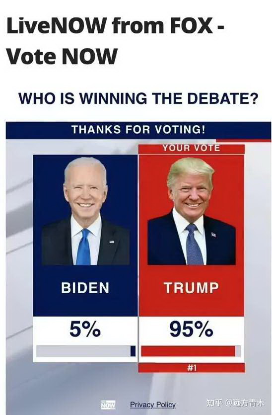 因此特朗普成了最大赢家,福克斯新闻的网络投票显示95%的美国人认为特朗普赢下了这场辩论。