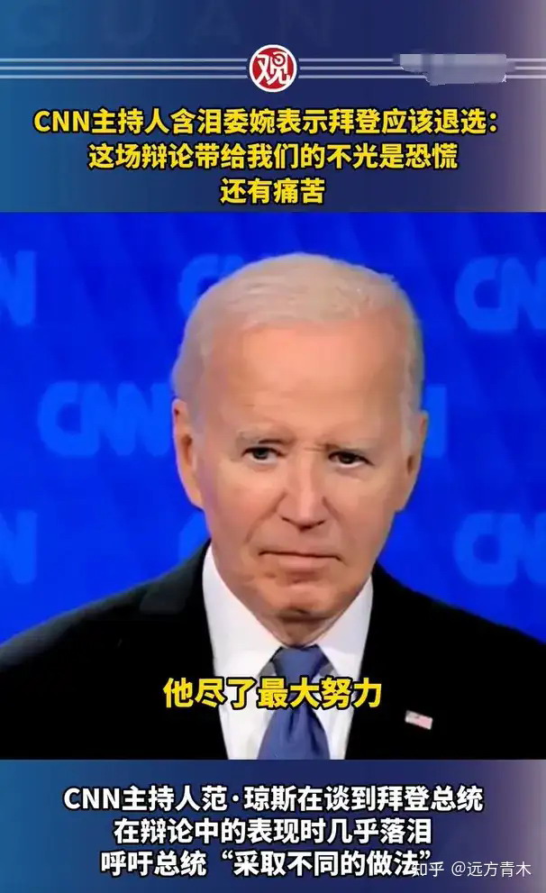 CNN主持人在节目中谈及拜登的辩论表现几乎落泪,说这场辩论带给大家的不光是恐慌,还有痛苦,委婉表示拜登总统应该退选,呼吁总统采用“不同的做法”。